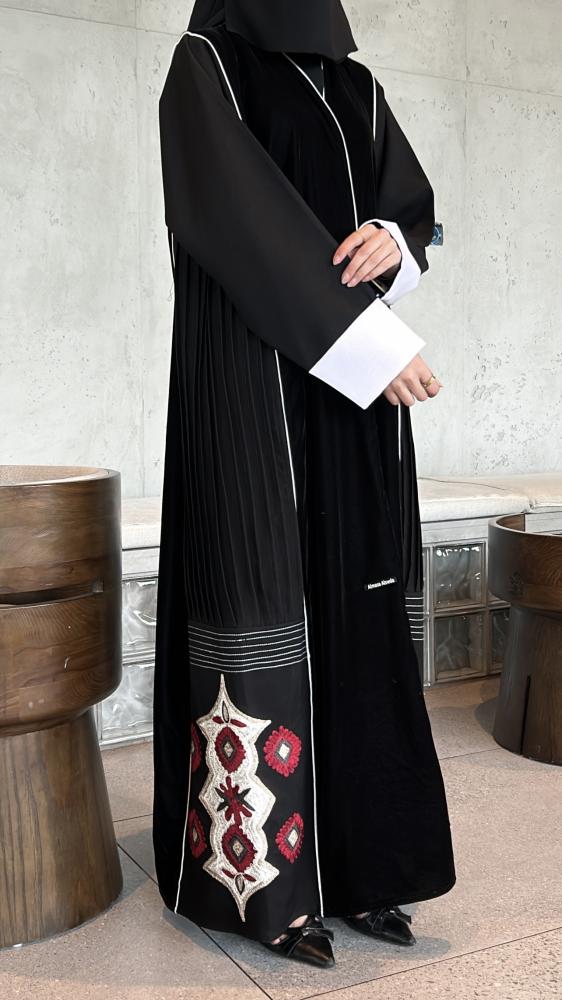 الإضافات : تصميم الأكمام قلاب والجوانب بقماش اللمار منتصف العبايه امام وخلف تحتوي على قماش قطيفة مع تطريز اسفل العبايه.